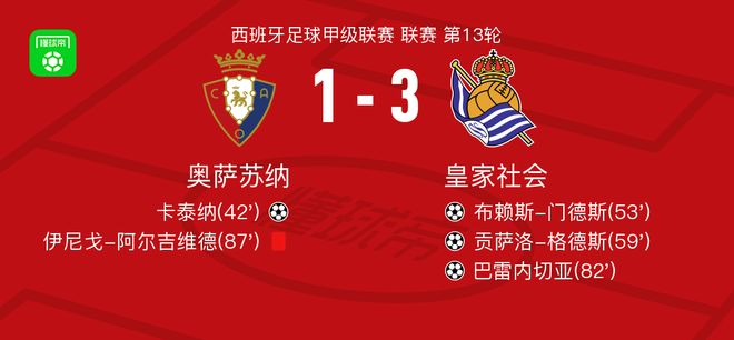 北京时间11月23日西班牙足球甲级联赛 联赛 第13轮,奥萨苏纳主场对阵皇家社会。奥萨苏纳卡泰纳破门。皇家社会布赖斯-门德斯破门,贡萨洛-格德斯破门,巴雷内切亚破门。最终比分奥萨苏纳 1-3 皇家社会。