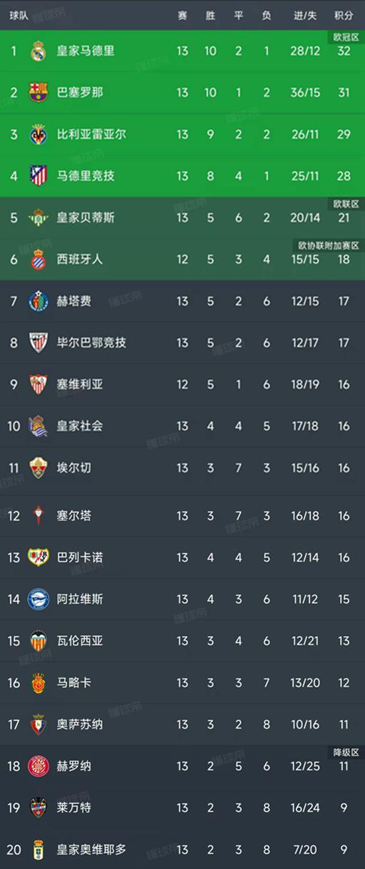 北京时间11月24日,随着皇马2-2战平埃尔切,赫塔费0-1不敌马竞,西甲第13轮的比赛已经结束了9场比赛,我们一起看看最新积分榜变动!