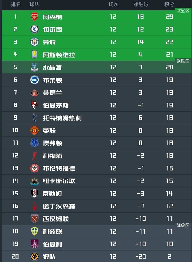 阿森纳笑晕?争冠3对手同轮翻车!6分断层领跑 第2至第12仅差5分